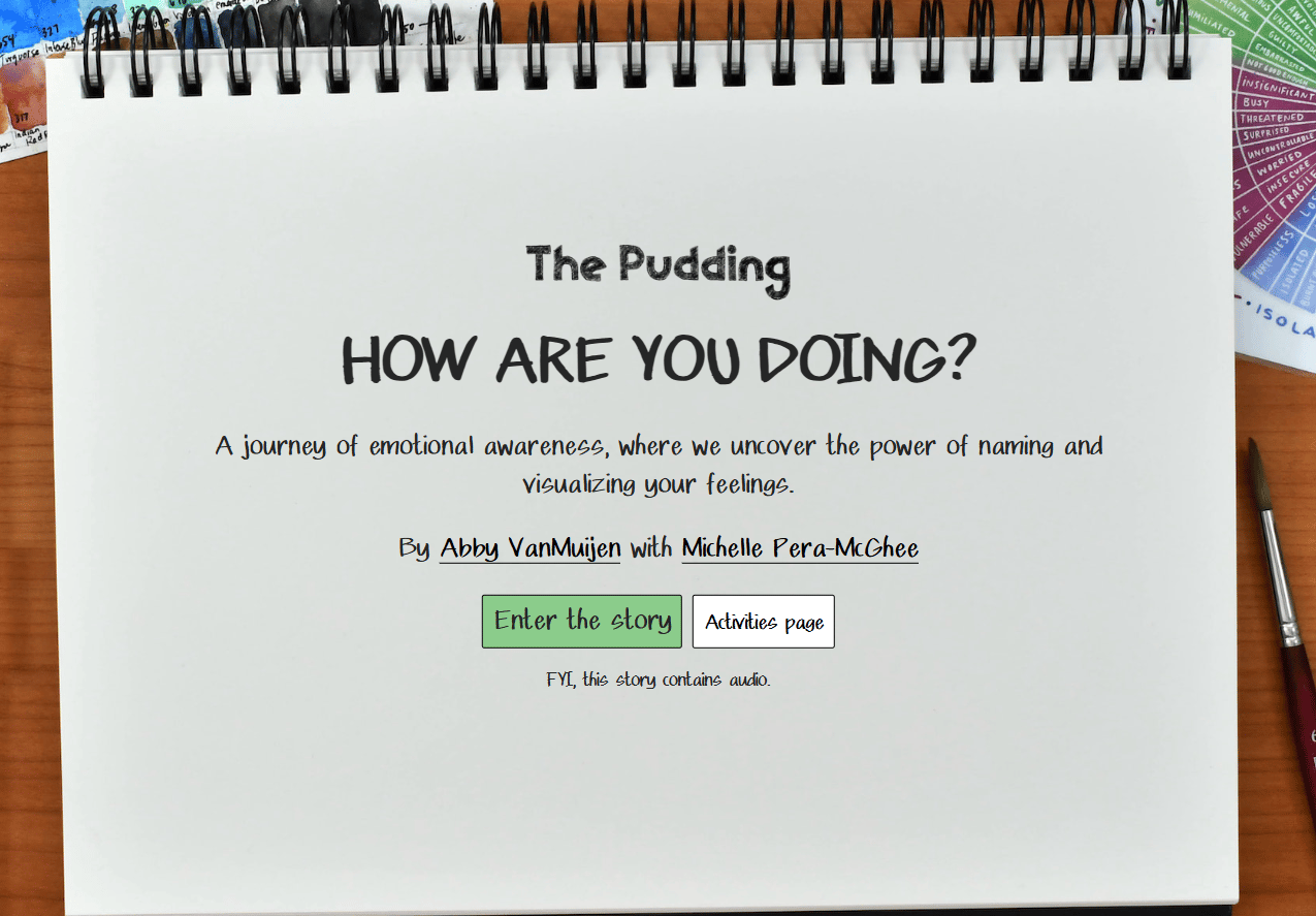The Puddingās Emotion Wheel interactive invites users to actively explore and name their own feelings through visual tools and exercises, rather than passively reading about emotions.